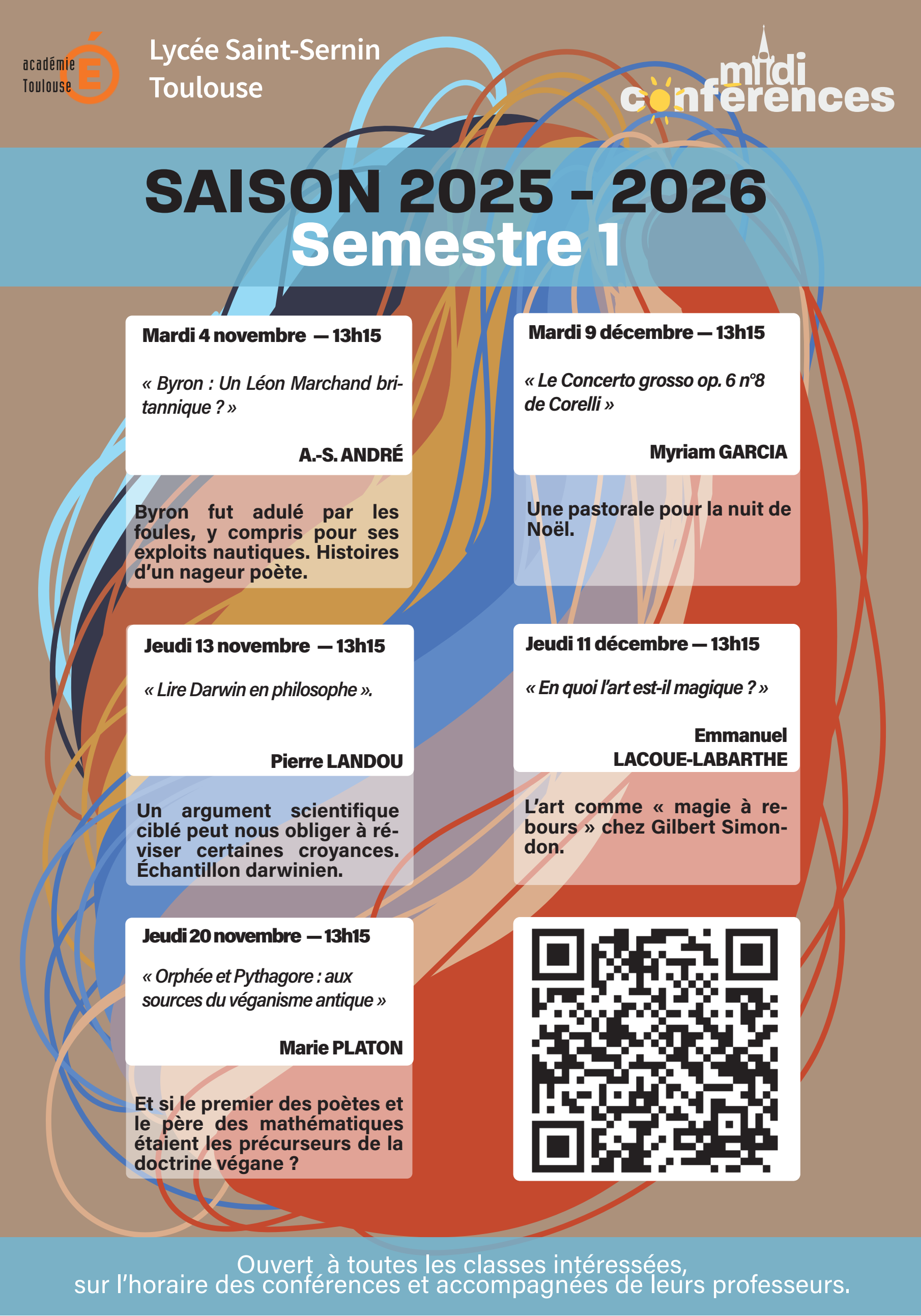 Depuis cinq ans, les Midi-Conférences du lycée Saint-Sernin offrent à notre communauté un rendez-vous original et stimulant : un moment suspendu, à la croisée du savoir et de la curiosité, où chacun peut venir écouter, découvrir, échanger.